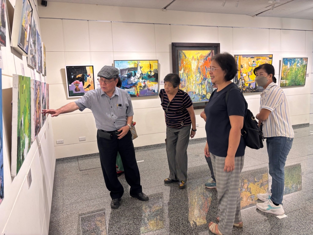 《離形‧心象—林金田繪畫創作展》共展出林金田老師近年創作的油彩作品57件,風格橫跨具象、半抽象與抽象三大領域。展覽以「離形‧心象」為題,呼應林老師藝術創作從形象描繪轉向內在心境表述的歷程。具象系列如《成美和園》、《永靖餘三館》、《忠實第夕陽餘暉》等,特別描繪彰化永靖地方風景與歷史建築,筆觸溫潤、色彩飽滿,展現藝術家對在地文化的深情連結。而抽象作品如《光影迷航》、《唯美的呢喃》等,則以自由流動的色彩與節奏構圖,傳達心靈世界的律動與感受。正如法國文學家普魯斯特所言:「真正的發現之旅,不在於尋找新的風景,而是擁有新的視野。」林金田老師透過藝術之眼,重新觀看生活與文化,展開深富意義的創作旅程。展覽現場亦展出林老師多年收藏並親自打磨的自然形石,來自台灣各地山林溪流,形成自然與藝術對話的獨特形式,展現其延續藝術眼光與美感鍛鍊於生活之中的實踐面貌。